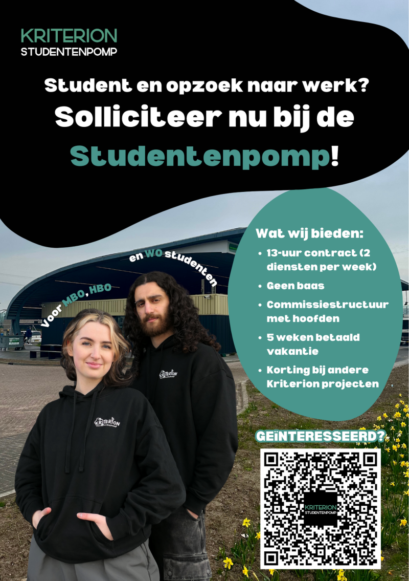Welkom bij de Kriterion Studentenpomp, een unieke werkplek waar studenten de touwtjes in handen hebben. Alles wordt door ons zelf geregeld – van voorraadbeheer, inkoop en administratie tot financiën, promotie en het onderhoud van het station. Er is geen baas, maar we werken met commissies waarin iedereen meebeslist, verantwoordelijkheid draagt en de kans krijgt om waardevolle ervaring op te doen.